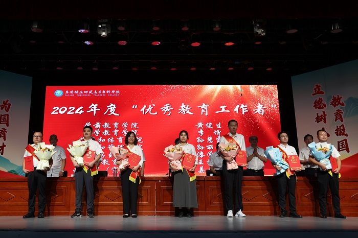 会上,校党委委员、纪委书记刘海涛带领新入职教师进行了入职宣誓;校党委副书记于华献宣读了《关于开展 2024年师德师风标兵、优秀教师、优秀教育工作者、优秀辅导员、优秀创新团队评选表彰工作的通知》,对丁传杰等6名“师德师风标兵”、马慧等15名“优秀教师”、王芮等15名“优秀教育工作者”、于静等6名“优秀辅导员”、小学教育专业创新团队等4个“优秀创新团队”予以表彰,并现场为先进集体和先进个人颁奖。