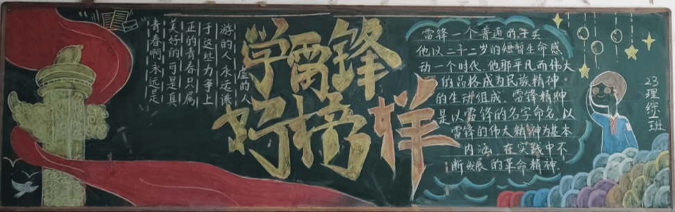 为弘扬新时代雷锋精神,深化"大思政课"育人成效,营造“人人学雷锋、处处见行动”的校园氛围,小学教育学院于3月3日至18日开展了以“传承雷锋精神 绘就青春风采”为主题的黑板报设计大赛。