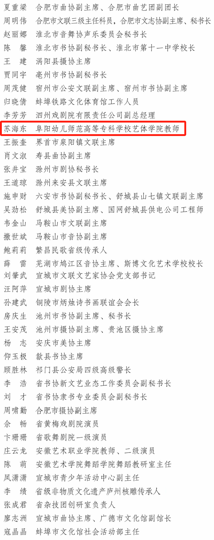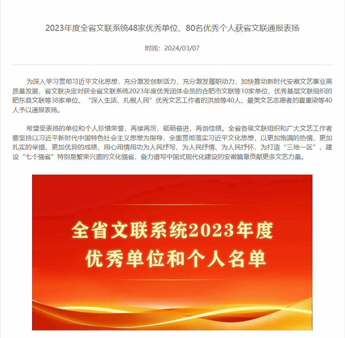 近日,安徽省文联公布了2023年度全省文联系统48家优秀单位、80名优秀个人的通报,我校教师苏海东荣获“最美文艺志愿者”荣誉称号。