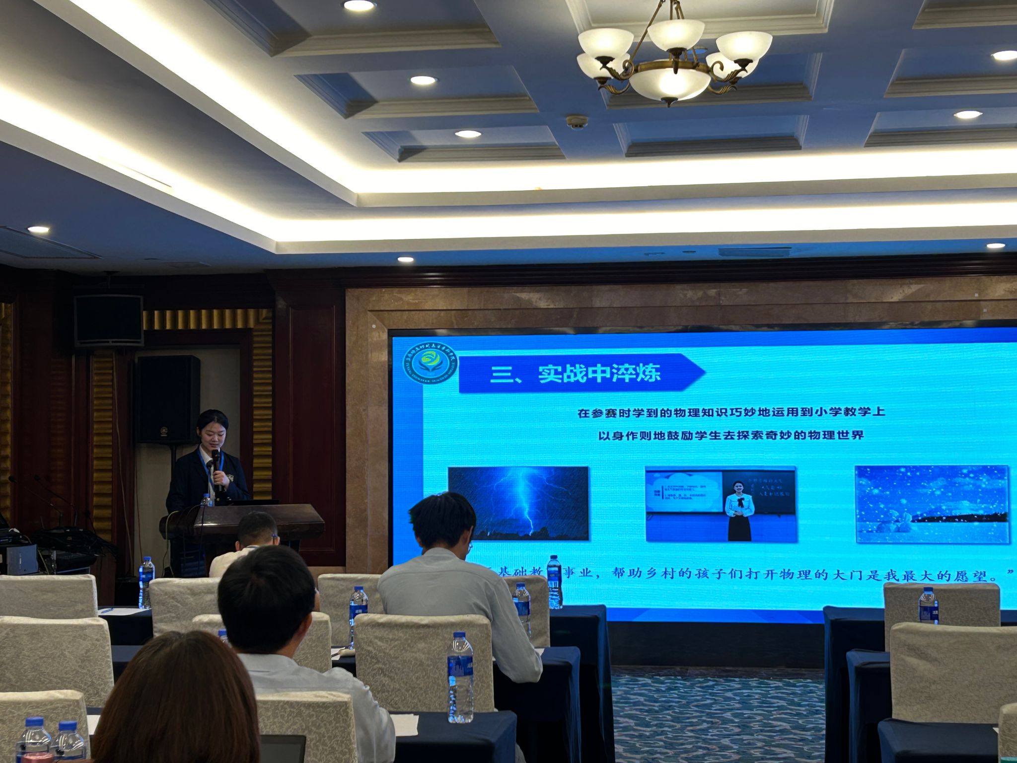 宋继英同学参加2023年全国大学生物理实验竞赛(CUPEC)并荣获二等奖,她结合自己定向师范生参赛体会做了题为《弘毅励能,CUPEC让我成长》的报告。分享了在参赛时学到的物理知识巧妙地运用到小学教学上,以身作则的鼓励学生去探索奇妙世界。(图/文 徐友鸽 ,初审:魏琳, 终审:郭玉敏)