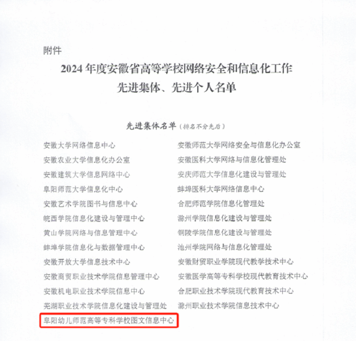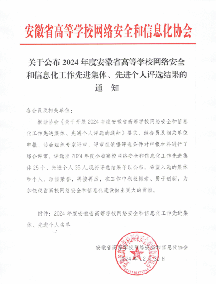 近日,安徽省高等学校网络安全和信息化协会发布了《关于公布2024年度安徽省高等学校网络安全和信息化工作先进集体、先进个人评选工作的通知》,我校荣获“2024年度安徽省高等学校网络安全和信息化工作先进集体”荣誉称号。
