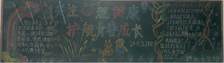 24托育2班的黑板报以“关注心理健康,护航青春成长”为主题,通过一幅幅精美的插画和温馨的话语,表达了关注心理健康、珍爱生命的美好愿望。同时,也引导同学们该如何培养自信心。22学前9班也在黑板报中为同学们分享了一首健康歌,“心平气和性开朗,严于律己贵有章;自娱自乐多保重,身心健康有延长”。这些黑板报都在通过多样化的形式,让同学们在轻松愉快的氛围中学习心理健康知识,提升自我认知与调节能力。