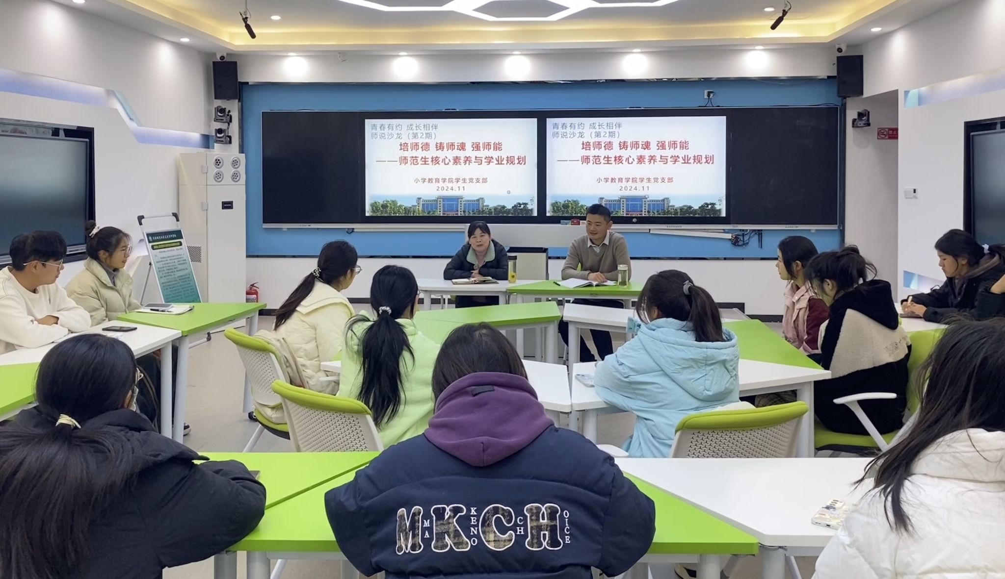 为帮助2024级新生明确自身定位,加强学业规划,增强职业认同感,提升职业素养,促进良好学风的形成,11月28日下午,由我校辅导员名师工作室主办,小学教育学院学生党支部承办的师说沙龙(第2期)以“培师德 铸师魂 强师能——师范生核心素养与学业规划”为主题,在文津楼401成功举办。本期师说沙龙邀请了小学教育学院院长郭玉敏,2024级各班学习委员和学生代表参加,活动由小学教育学院学生党支部书记刘磊主持。